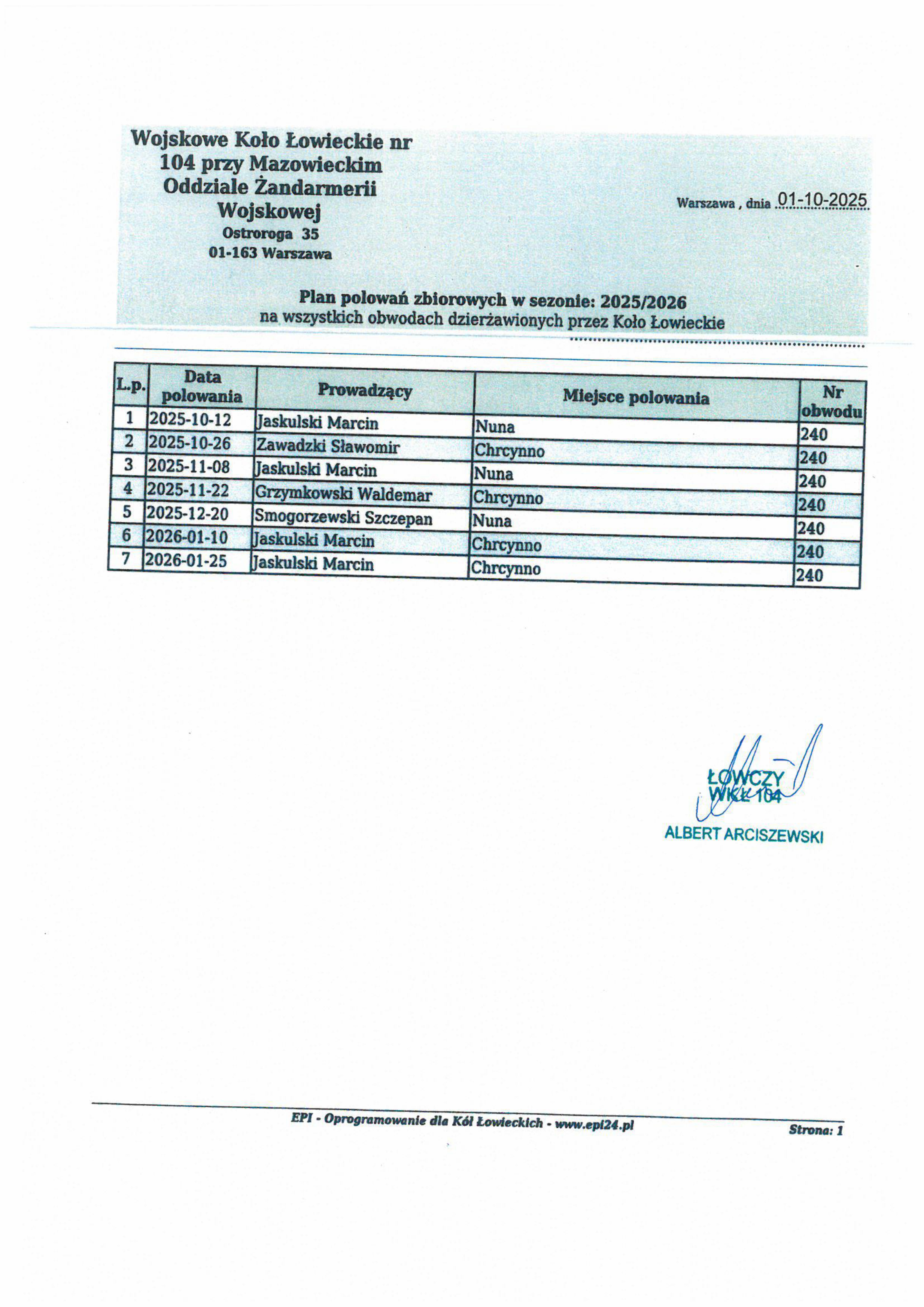Plan polowań zbiorowych Wojskowego Koła Łowieckiego nr 104